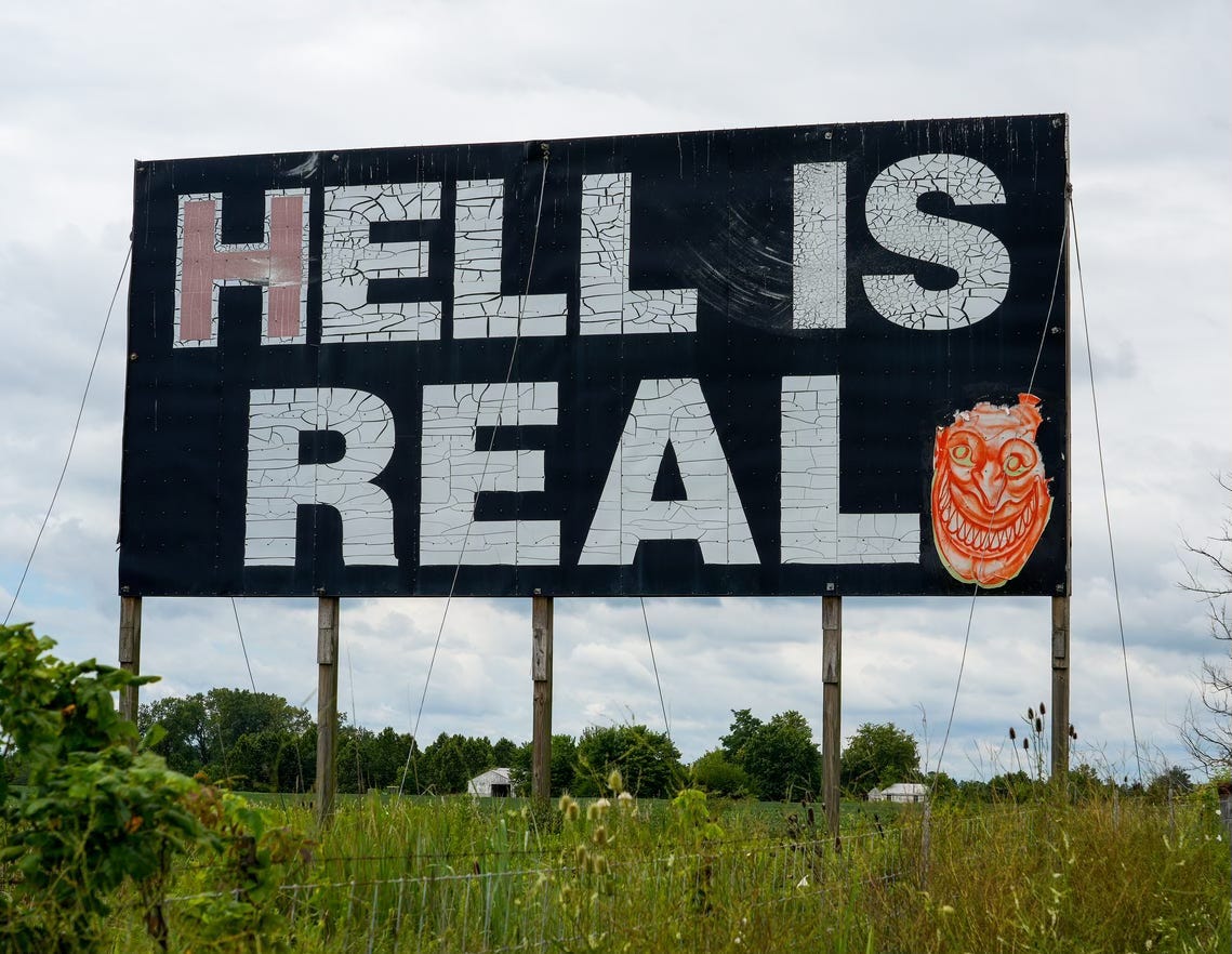 What’s the story with the “Hell is Real” sign?